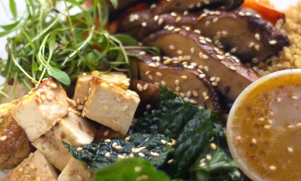 Hongos shiitake, zapallo y tofu asados, quinua, kale, germinados y ajonjolí con una vinagreta de miso y jengibre. Un bowl super nutritivo y delicioso perfecto para el almuerzo o cena.