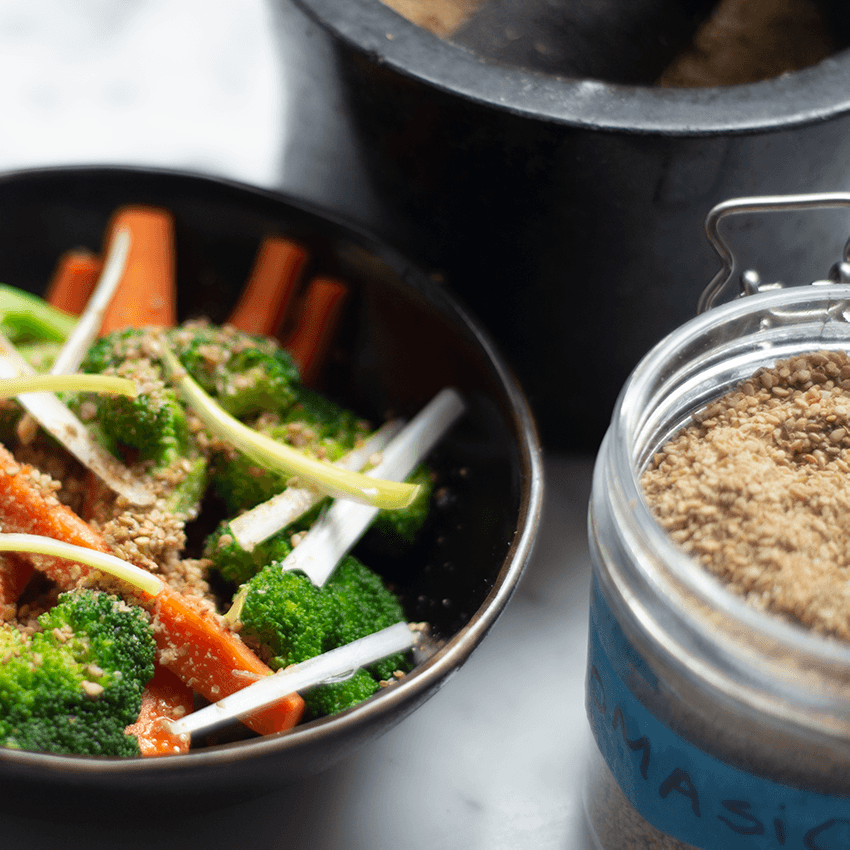 El gomasio es un topping japonés elaborado con ajonjolí integral y sal marina que eleva tus comidas. En COCO & LULA remojamos el ajonjolí y luego lo tostamos a fuego muy bajo, esto hace que podamos aprovechar sus beneficios. El gomasio es rico en calcio, una cucharada aporta 88 mg de calcio, también es rico en fibra, en magnesio y en hierro. Lo puedes usar como topping para ensaladas, tostadas, arroz etc.