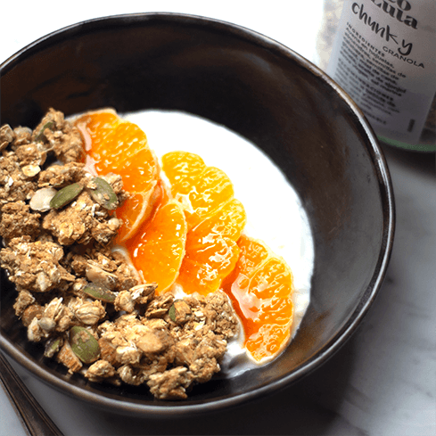 Sola, sobre cubos de fruta fresca, con leche de nueces o yogur hace un desayuno, snack o postre absolutamente espectacular