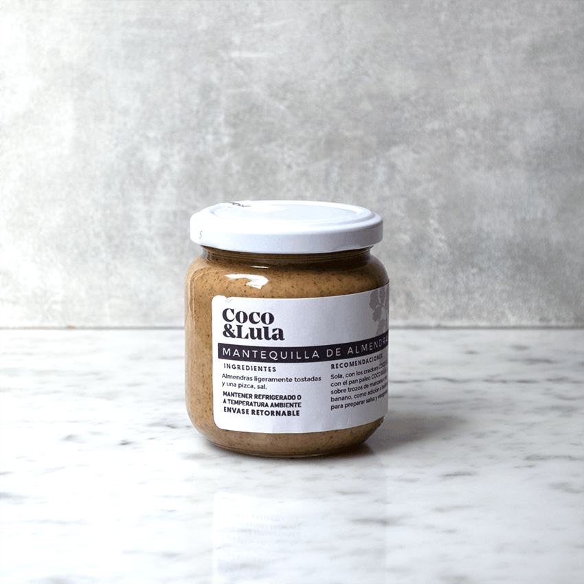 Mantequilla de almendras, de solo almendras y una pizca de sal marina.